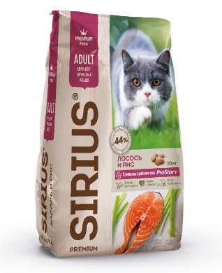 Корм Сириус "Лосось и рис" для кошек. Полноценный ежедневный рацион для взрослых кошек. Корм обогащен пробиотическим комплексом для повышения иммунитета. Не содержит пшеницу.